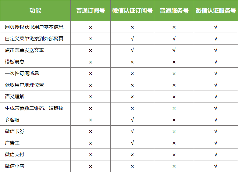 而认证之后的订阅号和服务号的区别就很大了,比如说网页获取用户信息(识别用户)、模板消息(给用户发通知)、获取地理位置(LBS服务)、微信支付(在线交易),这些订阅号都是不支持的。
